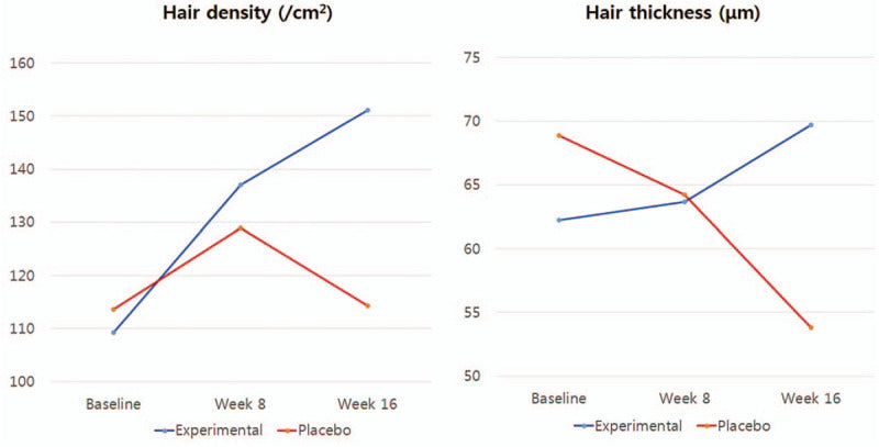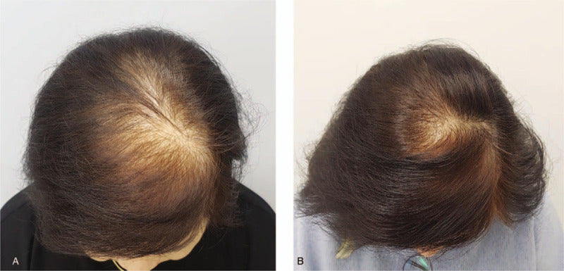 "Hair vertex view of global photography of a 62-yr-old female patient in the treatment group, diagnosed with Ludwig type II hair loss. Compared to baseline, there was a 25% increase in hair density and a 3.1% increase in hair thickness at 16 wk. A. Baseline, B. 16 wk."