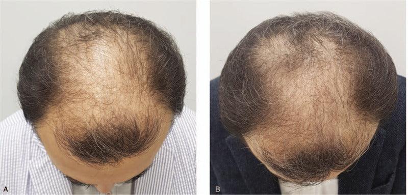 "Hair vertex view of global photography of a 59-year-old male patient in the treatment group, diagnosed with Norwood-Hamilton type V hair loss. Compared to baseline, there was a 50% increase in hair density and a 14.9% increase in hair thickness at 16 wk. A. Baseline, B. 16 weeks."